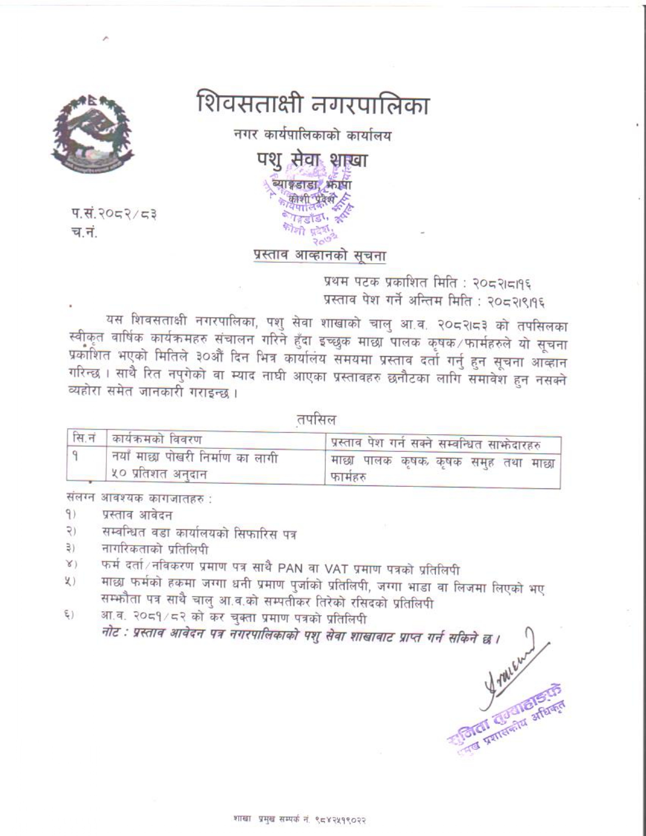 माछा पोखरी निर्माण सम्बन्धी प्रस्ताव आव्हानको सूचना ।।